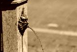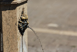 Closeup of a fountain with bronze lion head in Italy. Street faucet with a lion head. Warm summer day.