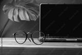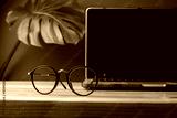 Outsourcing business, work concept. Front view of blank screen laptop, eyeglasses on wooden table with exotic tropical leaf monstera on pastel brown background in minimal style. Selective focus