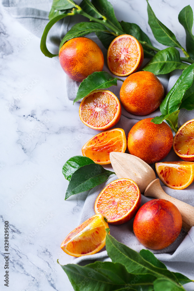 Sweet sicilian blood oranges on a marble table