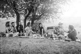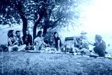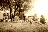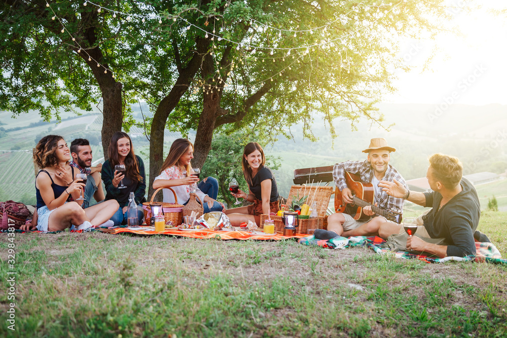 Picnic in the countryside - Group of young friends at sunset on spring day are sitting on the ground in a park near trees - They drinking red wine and eating grilled meat with barbecue and play guitar