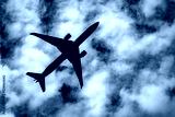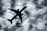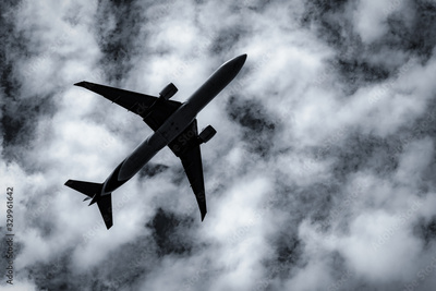Commercial airline flying on dark sky and white fluffy clouds. Under view of airplane flying. Aviation business crisis from coronavirus. Failed journey vacation flight. Air transportation. Sad travel.