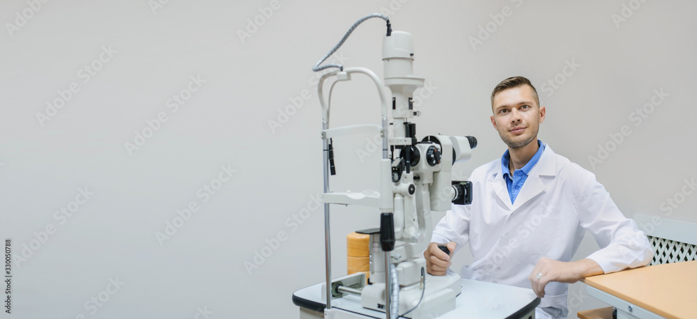 Young beautiful doctor/eye specialist/optometrist in an ophthalmologic clinic