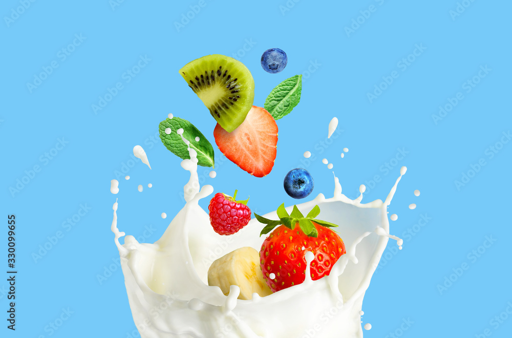 Fruit berry mix falling in milk and splashing isolated on blue background. Smoothie or milkshake prepearing.