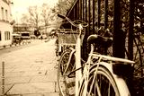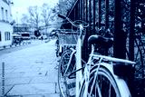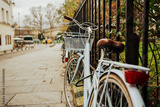 White parked bicycle in city. Bicycle parked next to sidewalk. Bicycle parked next to industrial factory. Italy.