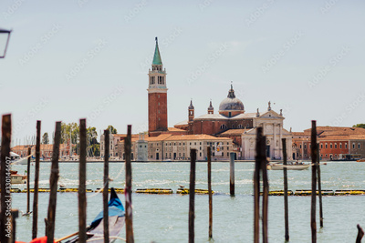 VENICE, ITALY JUNE 17, 019- View of San Giorgio Maggiore in Venice, Italy. Gondolas at Saint Mark's Square and church of San Giorgio Maggiore on background, Italy.