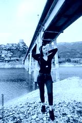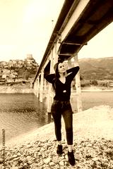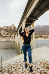 Attractive girl stands on the waterfront with views of the mountain lake Turano and village. A girl is resting in the mountains. Panorama of the mountains.