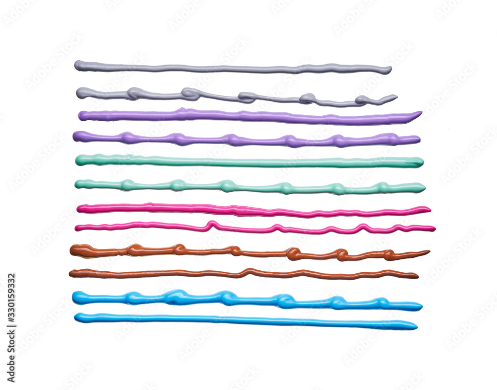 Texture and strokes of multicolored acrylic paint with sparkles on a white background