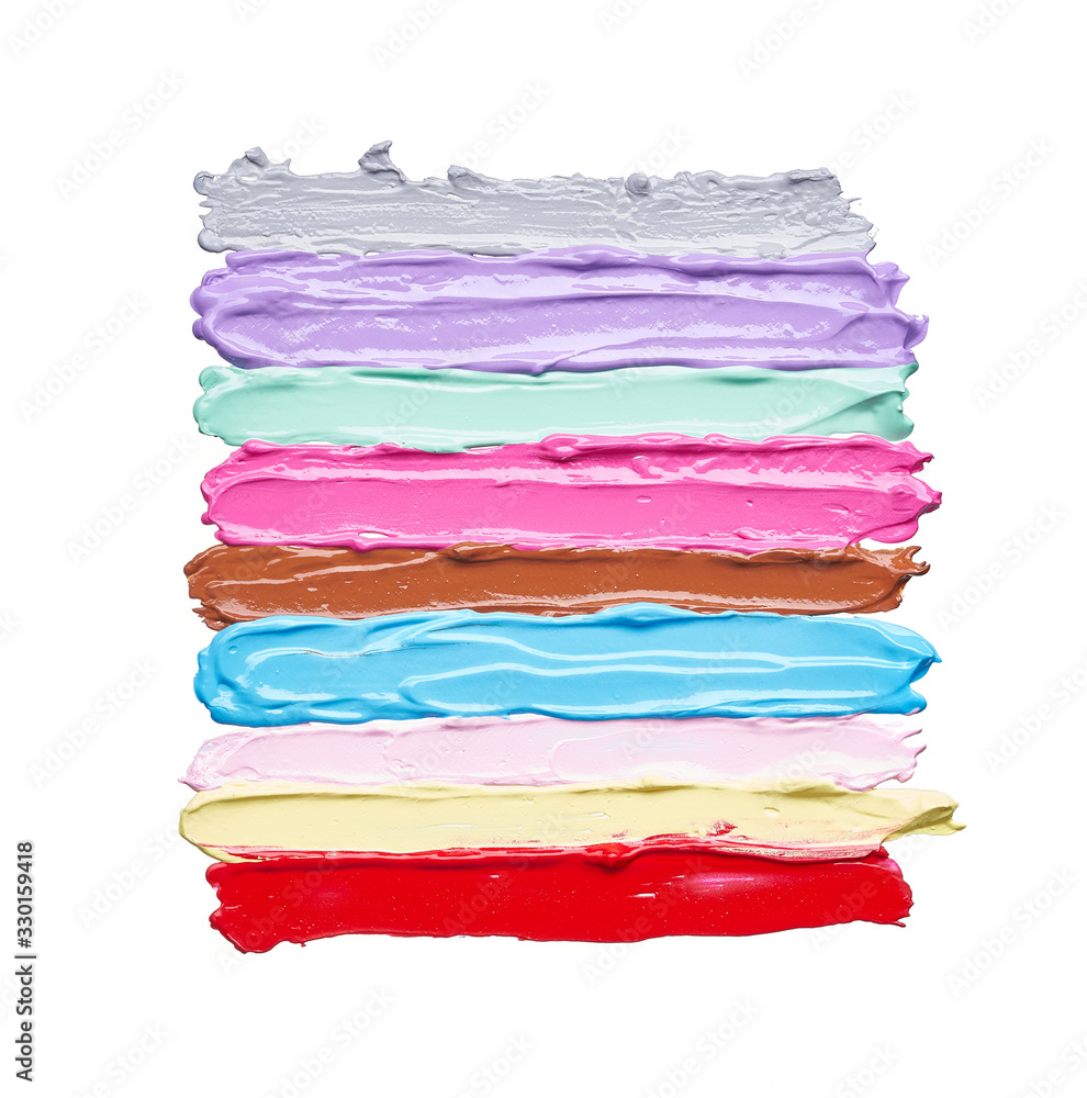 Texture and strokes of multicolored acrylic paint with sparkles on a white background