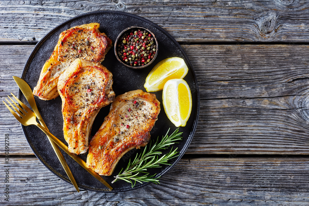 fried pork rib chops with lemon wedges
