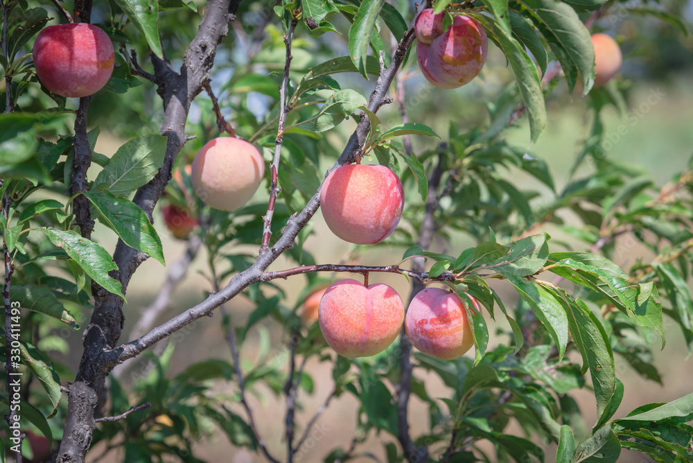 Ripe and tasty peaches on tree branch at fruit farm in Waxahachie, Texas, USA
