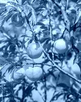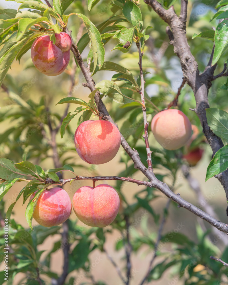 Ripe and tasty peaches on tree branch at fruit farm in Waxahachie, Texas, USA