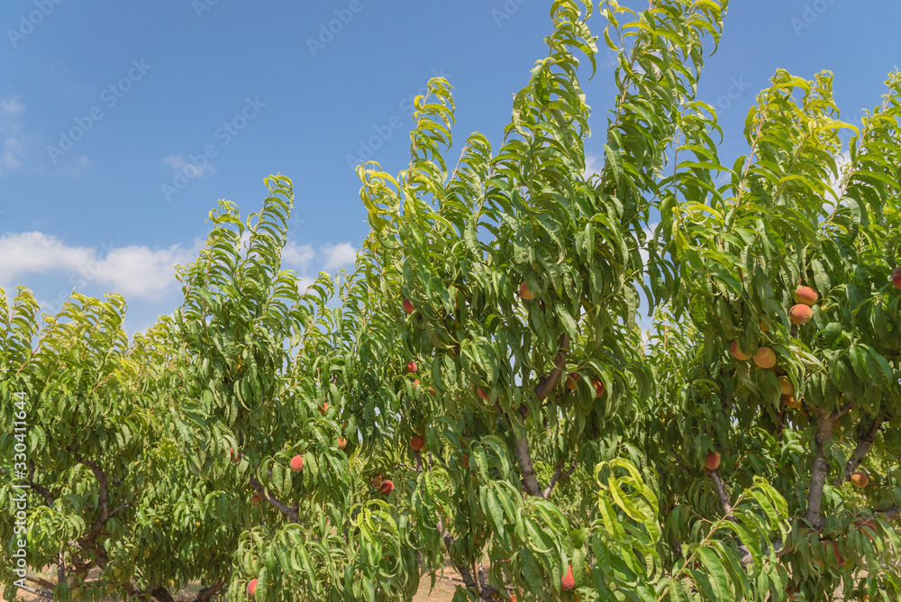 Large peach trees with vigorous load of ripe fruits under cloud blue sky