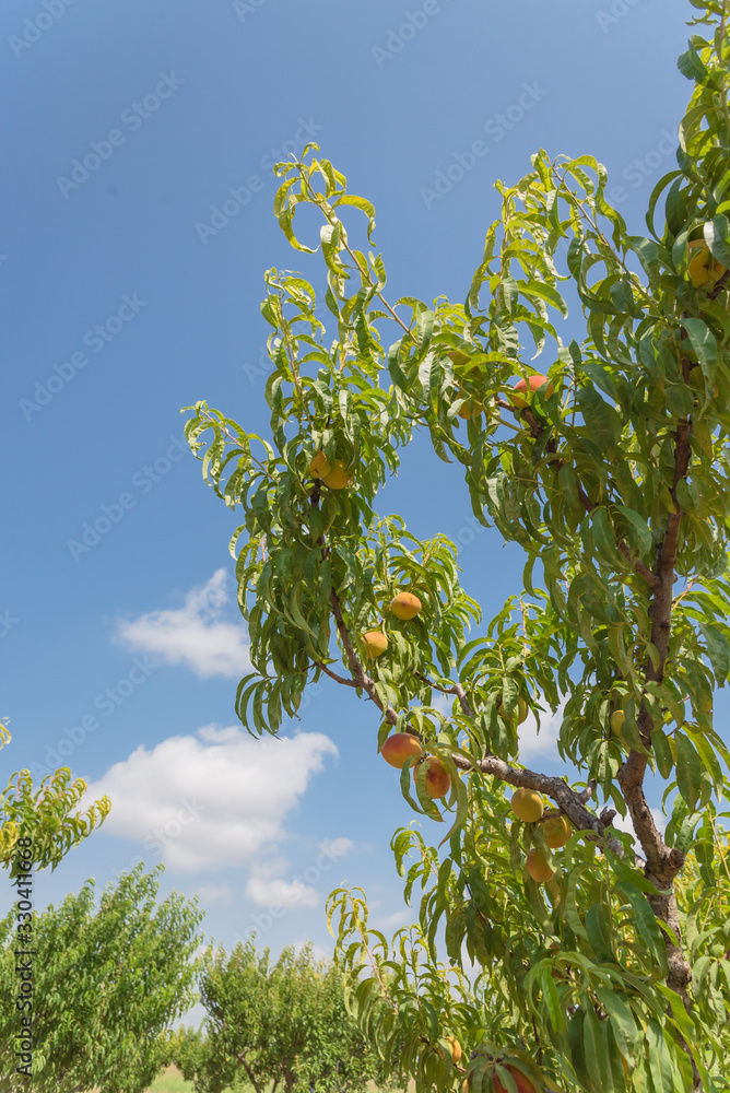 Row of peach trees with cloud blue sky background at fruit farm in Waxahachie, Texas, USA