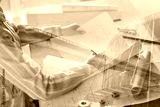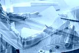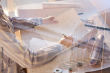 Triple exposure of female architect working in office, modern building and bridge