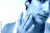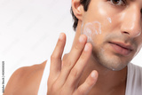 Young caucasian man apply moisturizer, cream face or sunscreen on handsome face for nourishing his face skin, protecting from sunlight Coo guy has beauty facial skin because he look after himself well