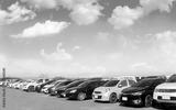 Car parked in large asphalt parking lot with white cloud and blue sky background.