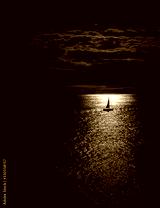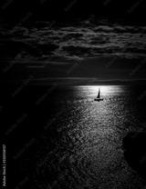 sailing into the sunet on the sea, closed to the coast of Mallorca, Spain in portrait format and monochrom bl;ack and white style