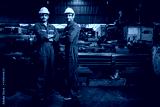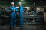Engineer men wearing uniform safety workers perform maintenance in factory working machine lathe metal.