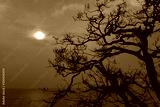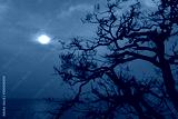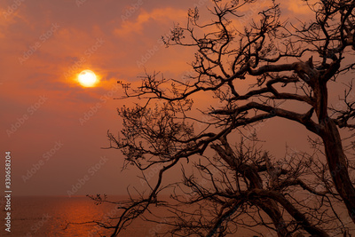 Beautiful silhouette leafless tree and sunset sky beside the sea. Romantic and peaceful scene of sea, sun, and sky at sunset time with beauty pattern of branches. Fall season with tranquil nature.