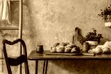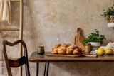 Stylish and minimalistic dining room interior with wooden table, retro chair, vegetables, cup of tea, bread, food and elegant kitchen accessories in wabi sabi concept.