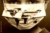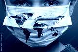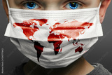 Face of a mask-wearing boy with fear in the eye Close-up on a gray background. Coronavirus and Air pollution pm2.5 concept Elements of this image furnished by NASA