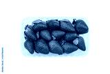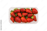 Plastic container with strawberries isolated on a white background. Fresh and ripe summer berries in the package. Top view, flat lay.