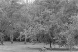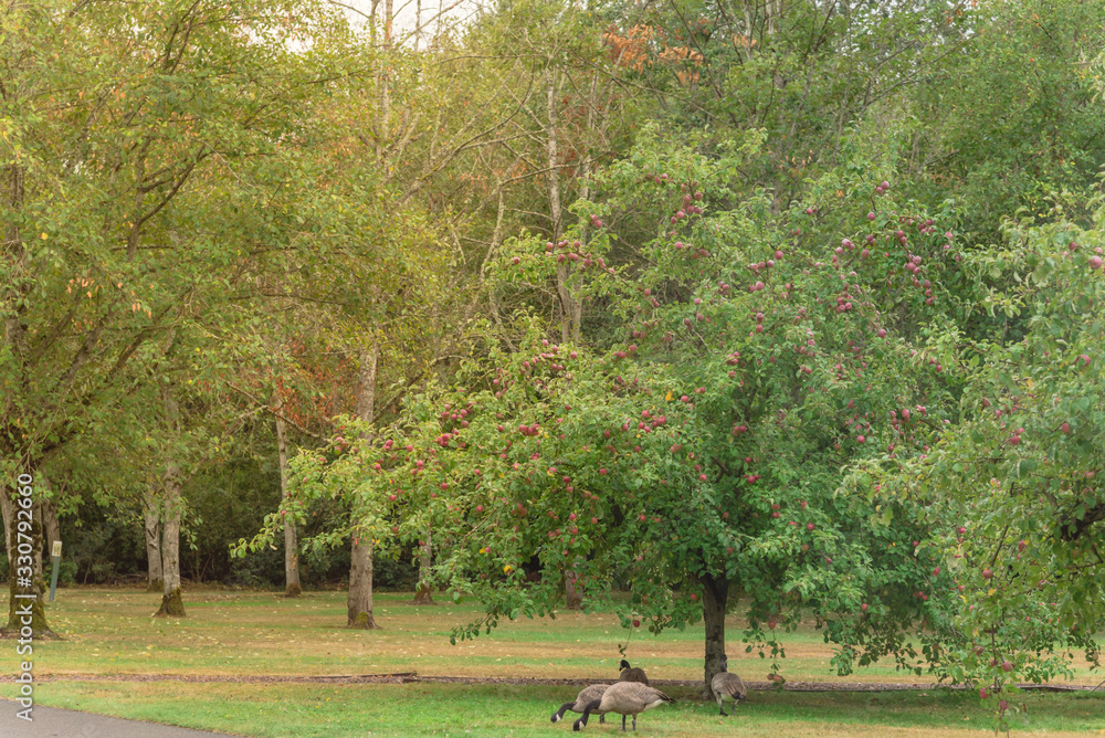 Apple farm with driveway and apple trees lush fruits and goose grazing underneath
