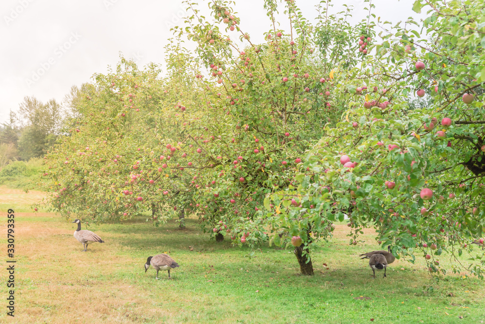 Row of apple trees with vigorous fruits and goose grazing at country orchard in Washington, USA