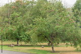 Apple farm with driveway and apple trees lush fruits and goose grazing underneath