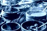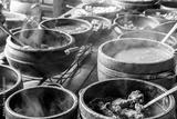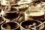 Typical Brazilian foods placed in clay pots and on a metal plate of a traditional wood stove
