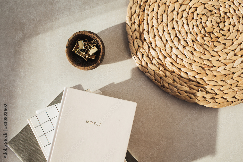 Flatlay notebooks, clips in wooden bowl, straw stand on beige concrete background. Office desk workspace. Business, work blank template. Flat lay, top view.