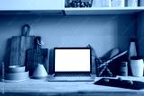 Kitchen workspace with blank copy space mock up laptop screen. Modern stylish kitchen interior design with wooden kitchenware. Front view blog, social media, website hero header template.