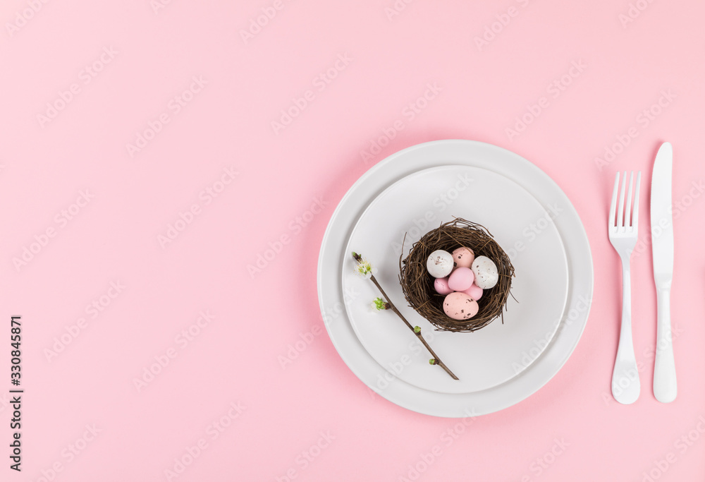 Easter holiday table setting on a pink paper background.