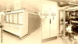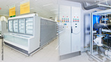 Refrigerated display cabinets. Refrigeration chamber for food storage in a supermarket. Cold stores in an empty supermarket. Refrigerator control system. Shield for control. Cooling control cabinet