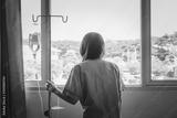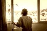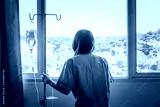 Back view of sickness patient woman standing nearly window in hospital ward, looking to outside and hope her health will be better. Conceptual of sickness woman feeling when admitted in the hospital.