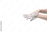 Woman washing hand with soap foam and water. Hand clean for good personal hygiene to prevent coronavirus or flu epidemic.Procedure of hand wash to kill germs, virus, bacteria. Cleaning dirty hands.