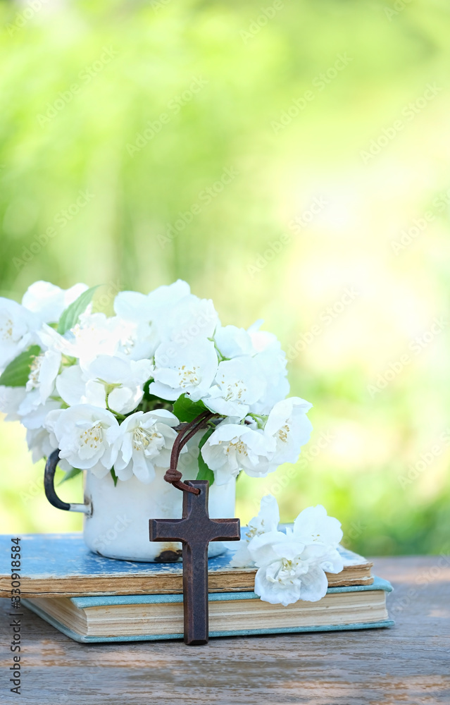 old biblical books, Christian wooden cross and flowers. cross, symbol of Easter and Christianity. copy space