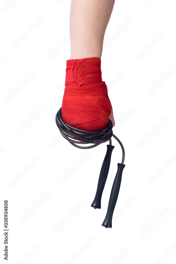 hand bandaged with red bandages for martial arts holds black jumpers, isolated on white