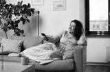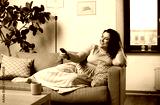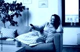 people and leisure concept - happy young woman lying on sofa with remote control and watching tv at home
