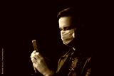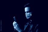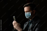 Young man with a medical face mask for protect covid-19 and in his hand is holding mobile phone with isolated black background. He is calling on the phone, possible phoning an ambulance for help.