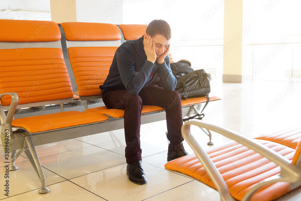 A passenger is waiting for his plane at the airport. A 35-40 year old man sleeps a bench while waiting for his flight at the airport.