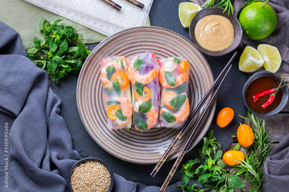 Spring or summer rolls with rice paper, shrimp and vegetable
