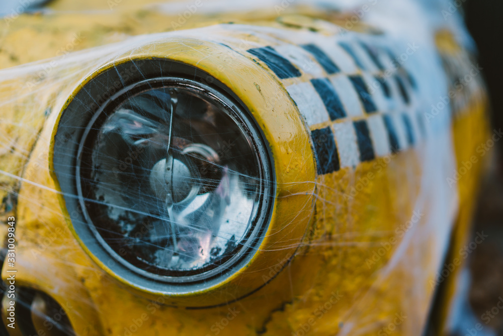 Old retro yellow taxi decorated with cobwebs
