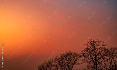 Beautiful silhouette leafless tree and sunset sky. Romantic and peaceful scene of sun, and red sky at sunset time with beauty pattern of branches. Fall season with tranquil nature. Beauty in nature.