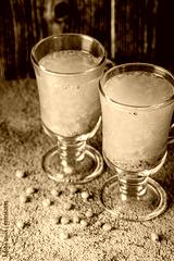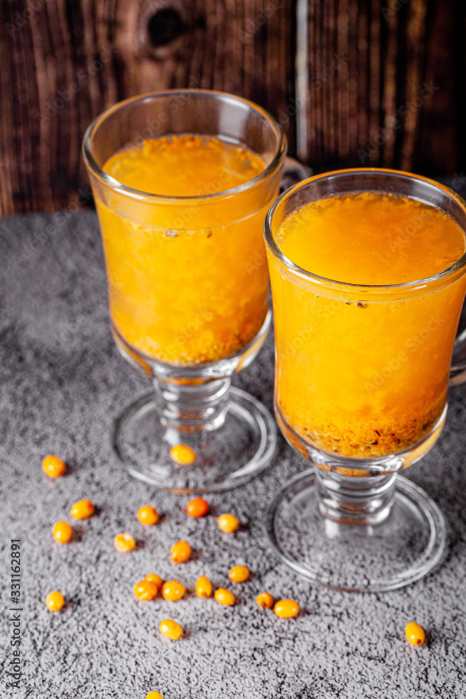 Modern tea in glass cups. Tea made from sea buckthorn berries and sugar. Glass teapot coffee press. background image, copy space text