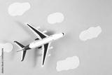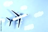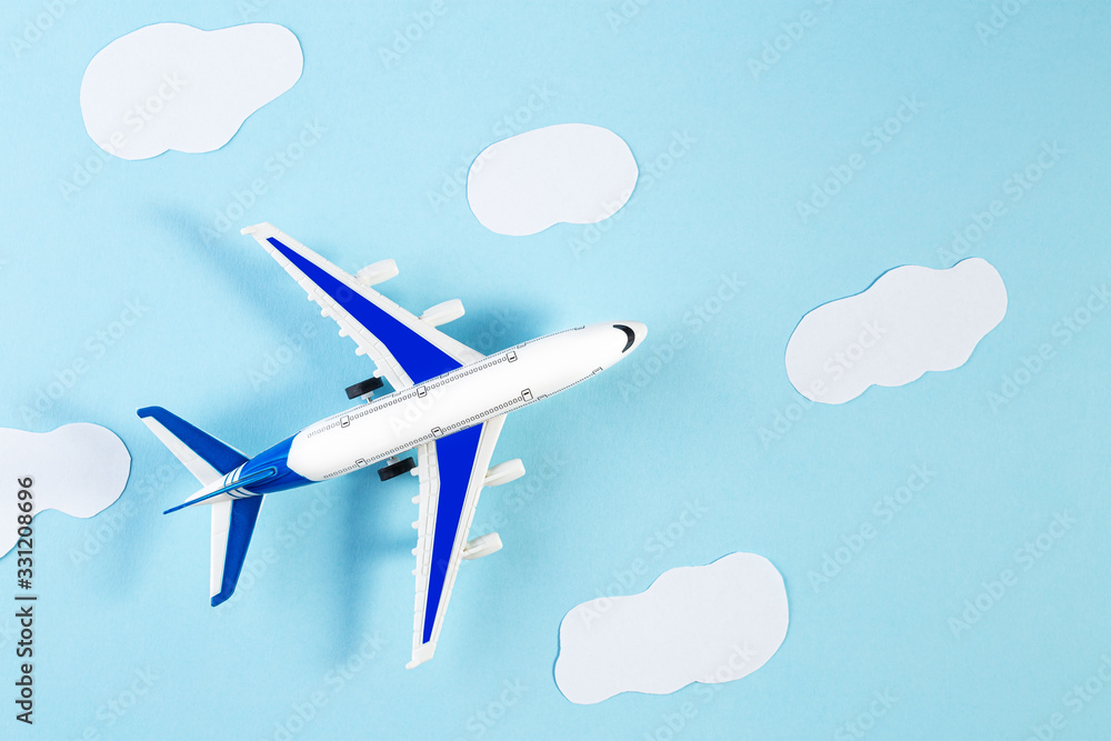 Model plane, airplane on blue pastel color background. Summer travel or vacation concept. Flat lay of miniature toy airplane. trendy minimal style, copy space