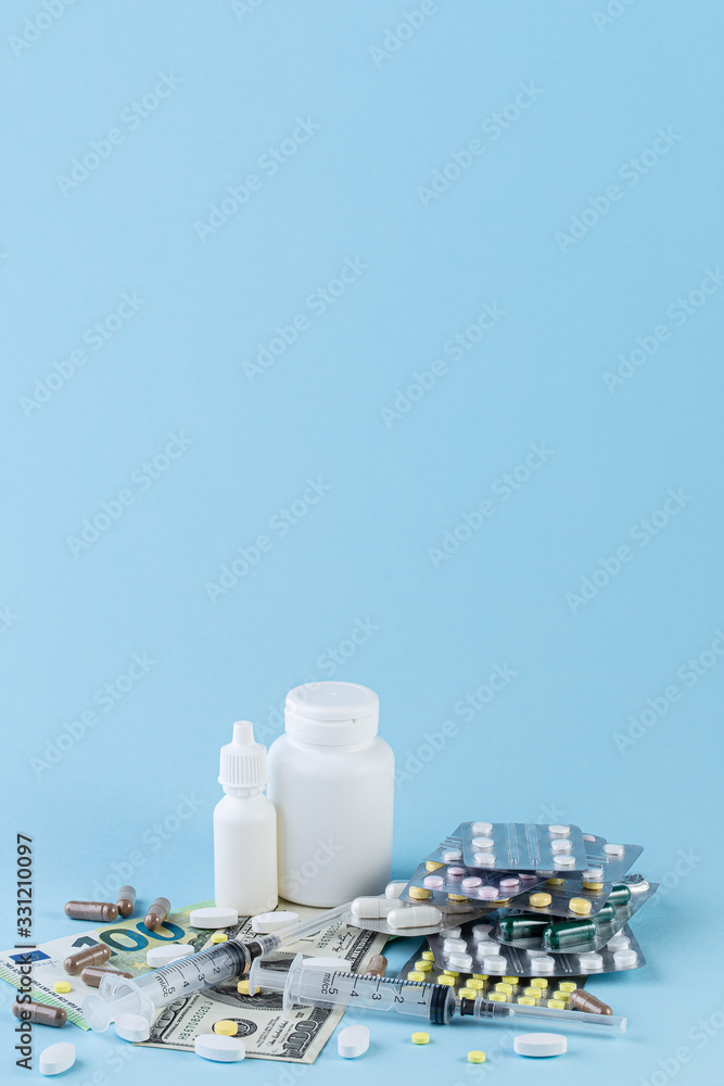 Medical pills are on a money on a blue background. Medical pills on money background as a symbol of health care costs. Medicine concept