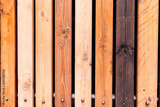 Rustic wooden fence made from treated differently colored boards. Vertical background wall made of vintage pine wood in vintage style.