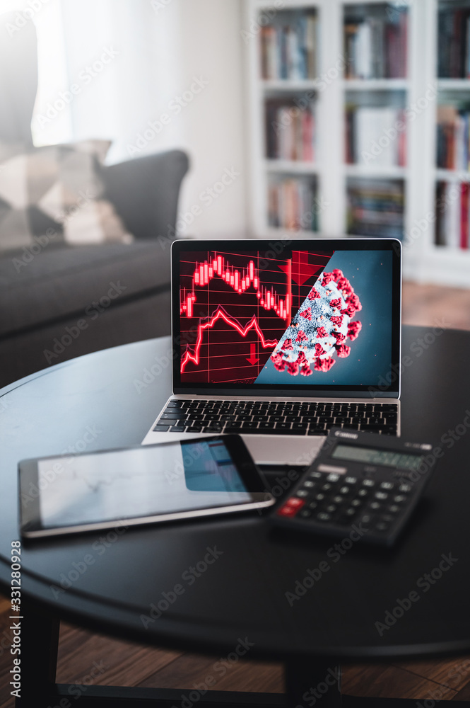 The coronavirus sinks the global stock exchanges. Desktop display showing the collapse of the stock market due to the global Coronavirus virus crisis. Novel coronavirus 2019 COVID-19 theme.