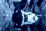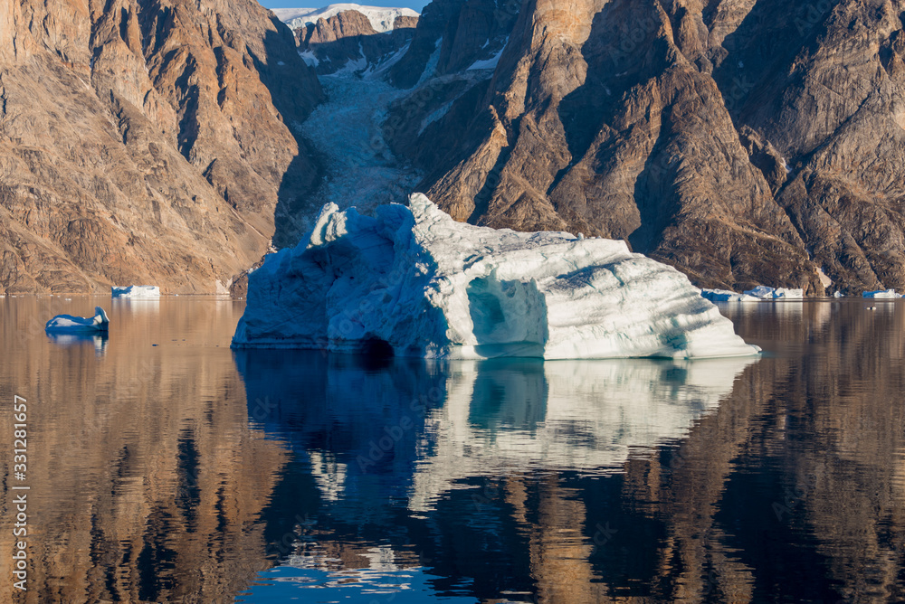 Iceberg in Greenland fjord with reflection in calm water. Sunny weather. Golden hour.